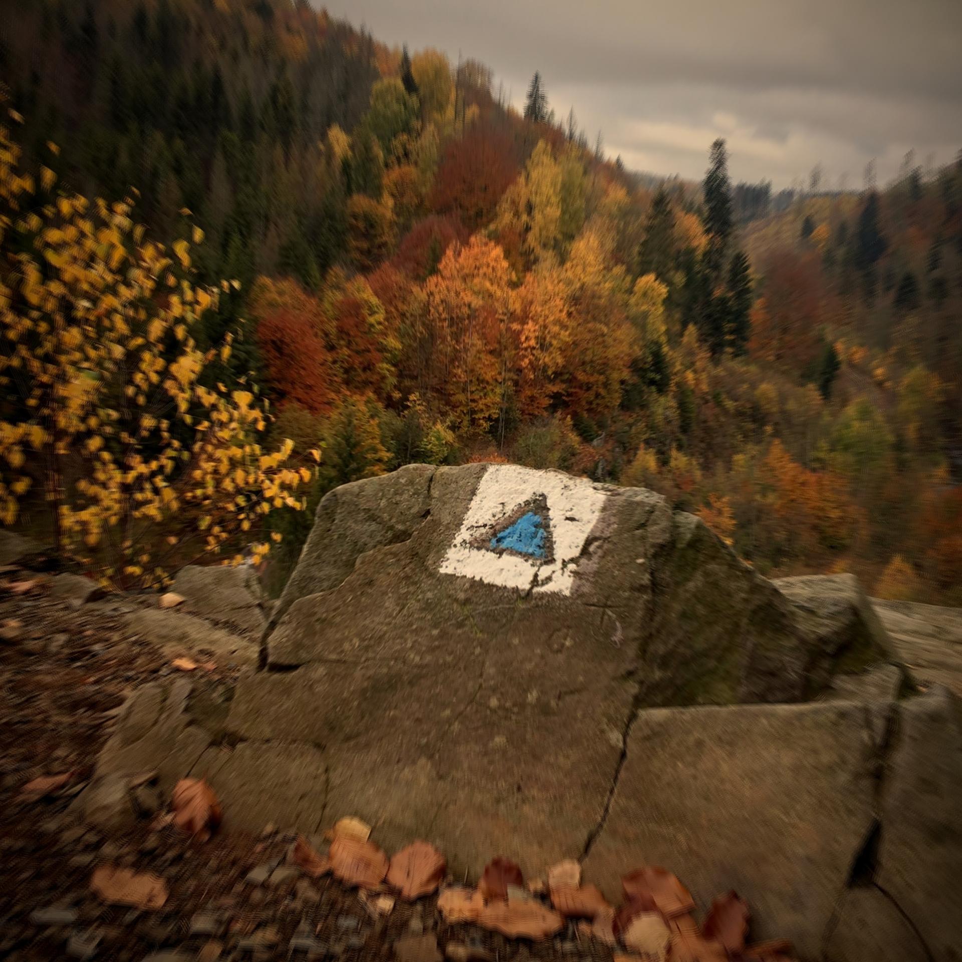 Dnes typická podzimní neděle. Šedé mraky nad hlavou, občas pár kapek a vítr šejkruje barevným listím na zemi. Strmé zářezy svahů Hrubovodských sutí, dole se klikatí Bystřička. Už žádné rozjásané léto, většina chat zazimovaná, brody, přes které jsme v létě běželi, teď vypadají studeně a cize.