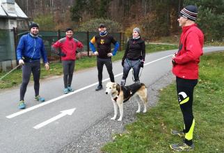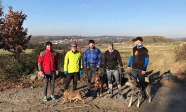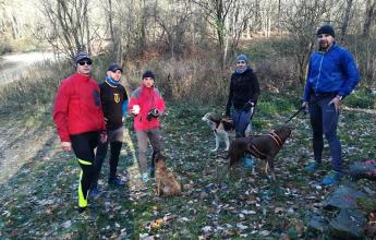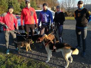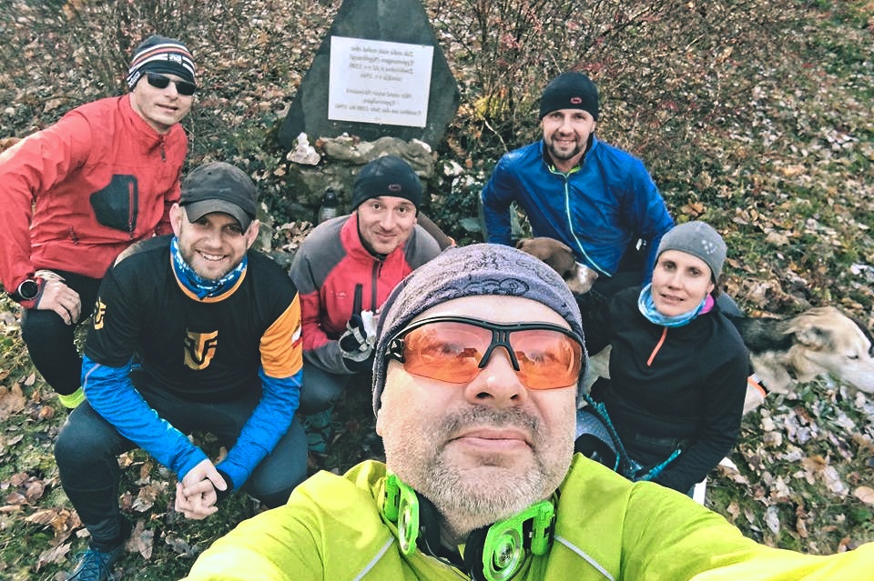 Zpět dolů přes bývalé sklady Eruptivy a jsme zase v civilizaci, v údolí Bystřičky už šedavo pod mrakem. Pět chlapů, Katka a tři psi, prostě kvalitní výběh...